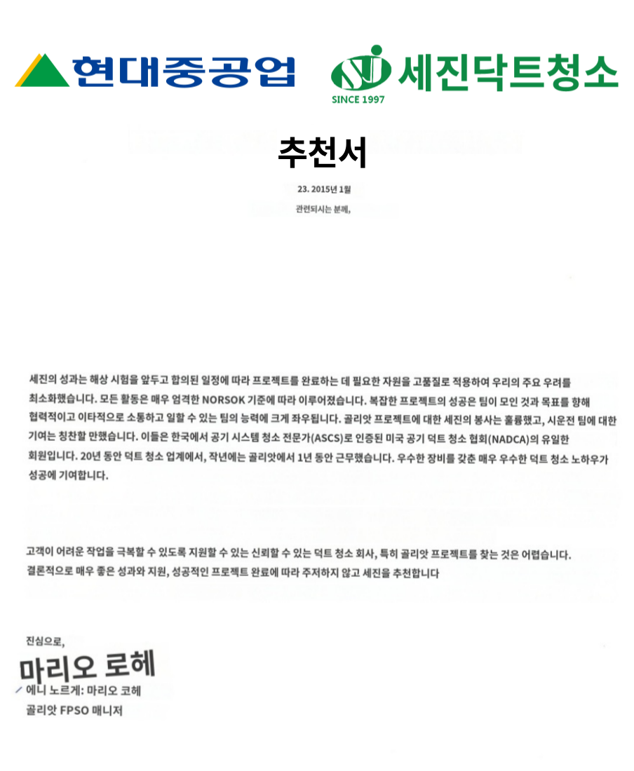 추천서 : 울산 현대중공업 선박 닥트청소(약10억원/1년)